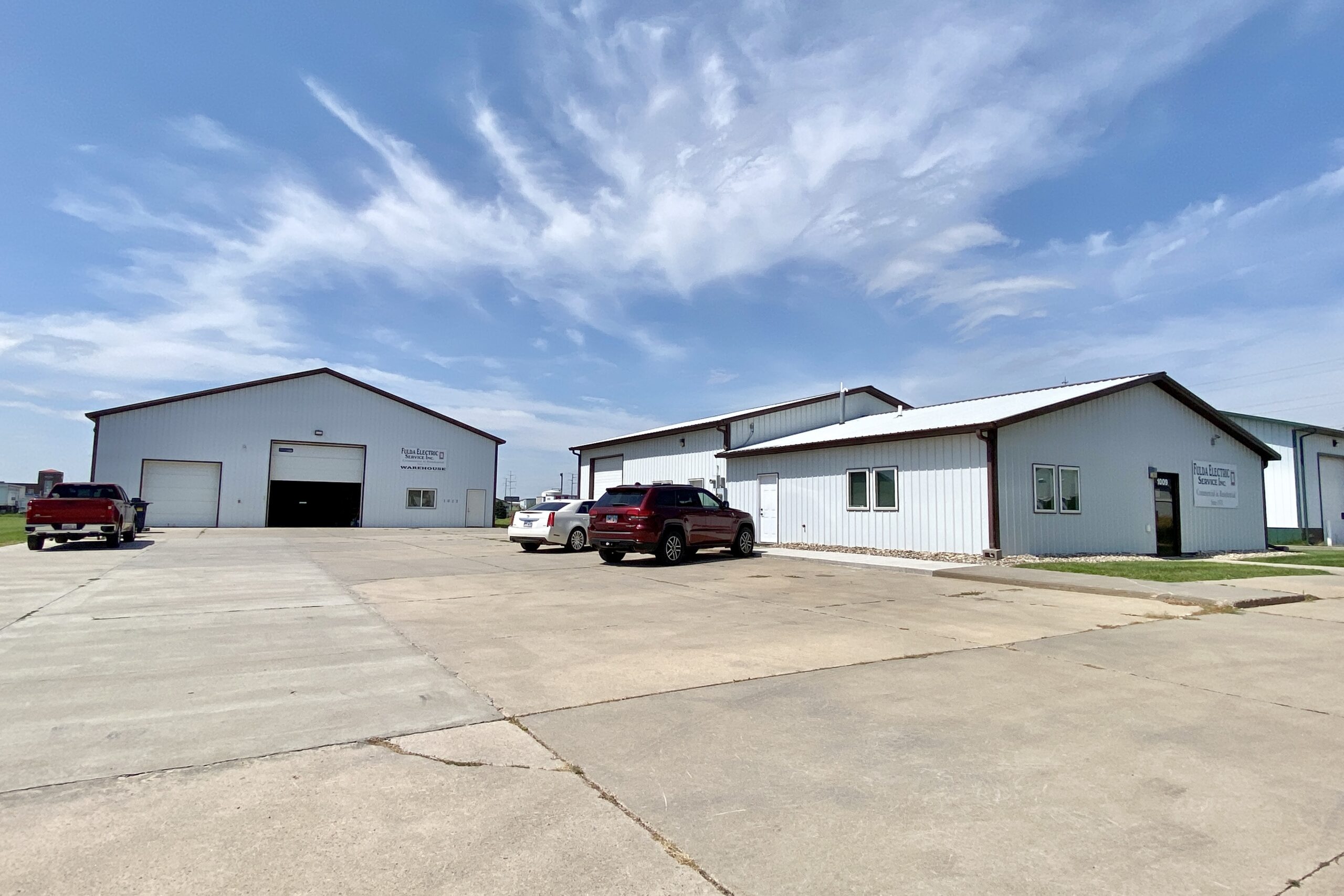 Large concrete parking area in the front and crushed concrete storage yard in the back.