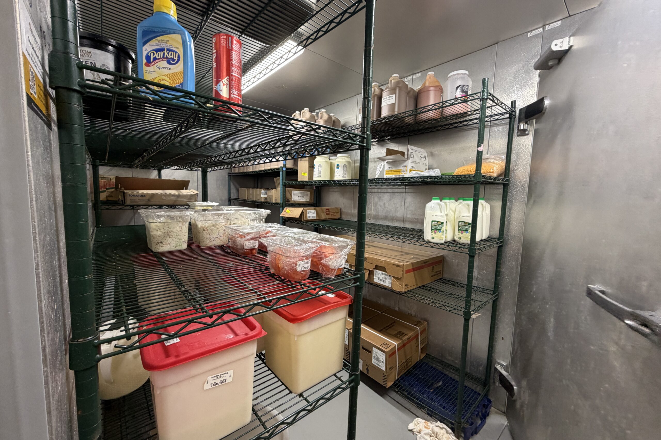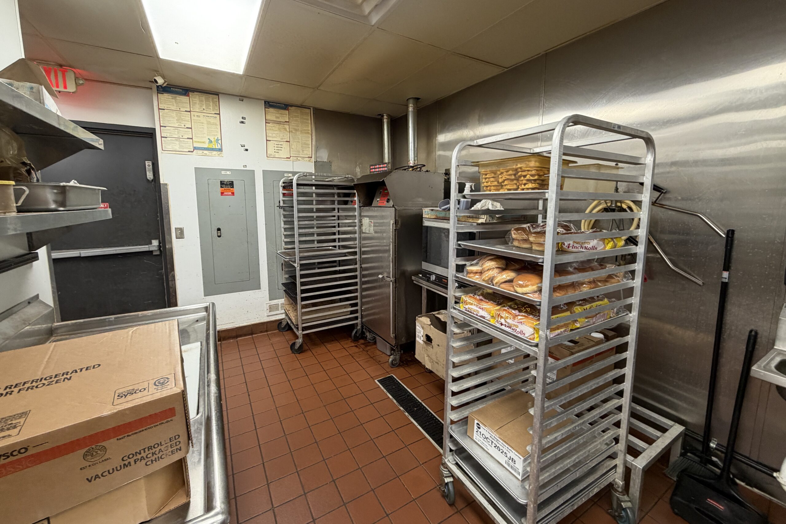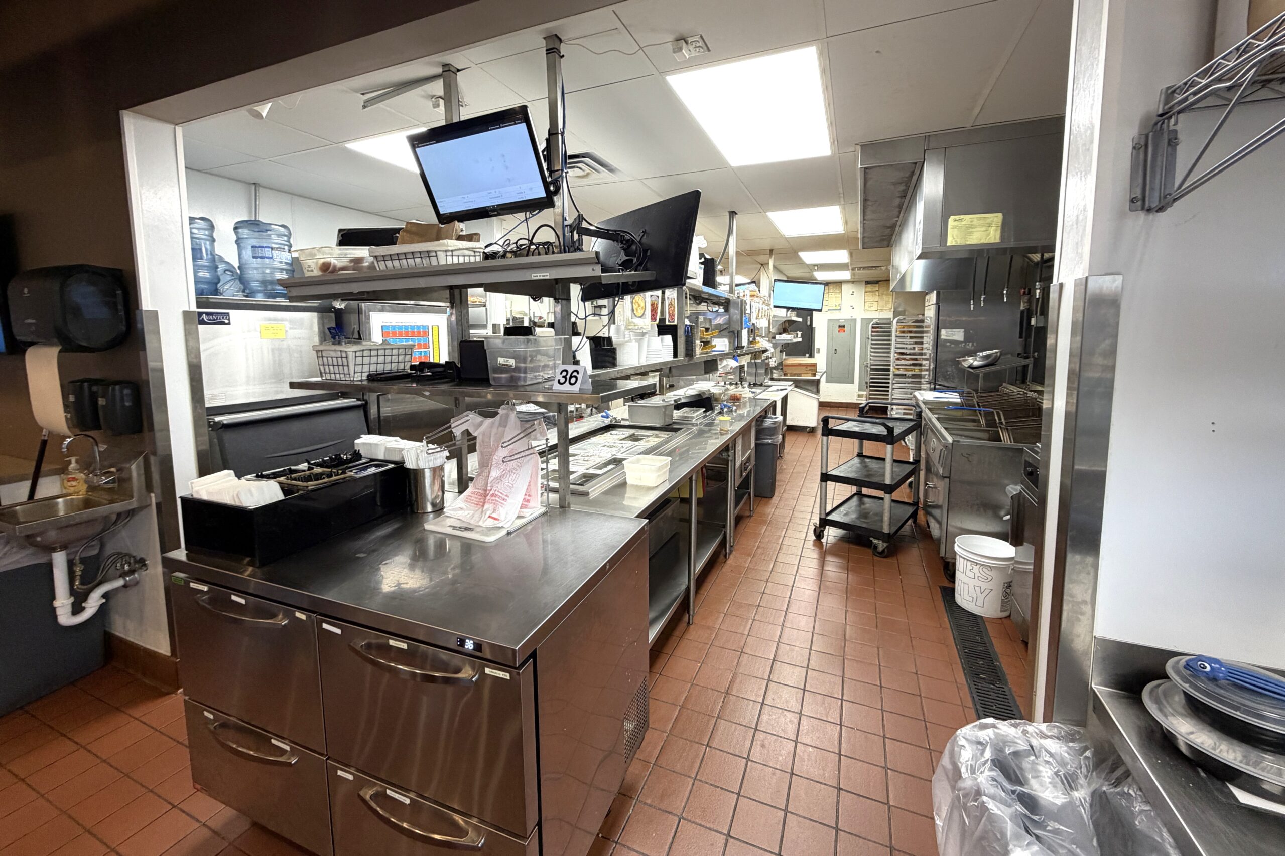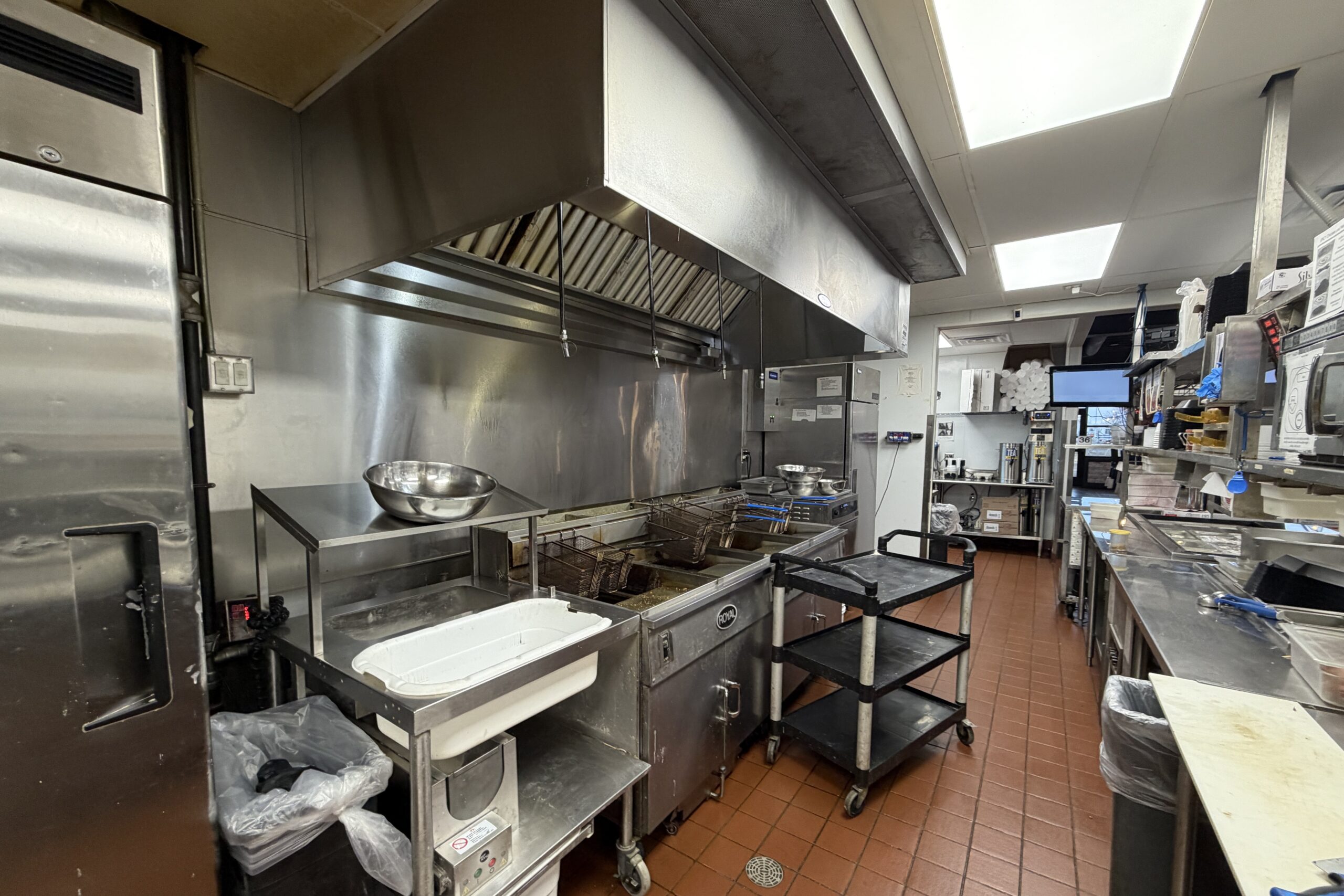 Includes dining area with seating; a full commercial kitchen with hood, walk-in cooler, and walk-in freezer; and a two-lane drive-thru.