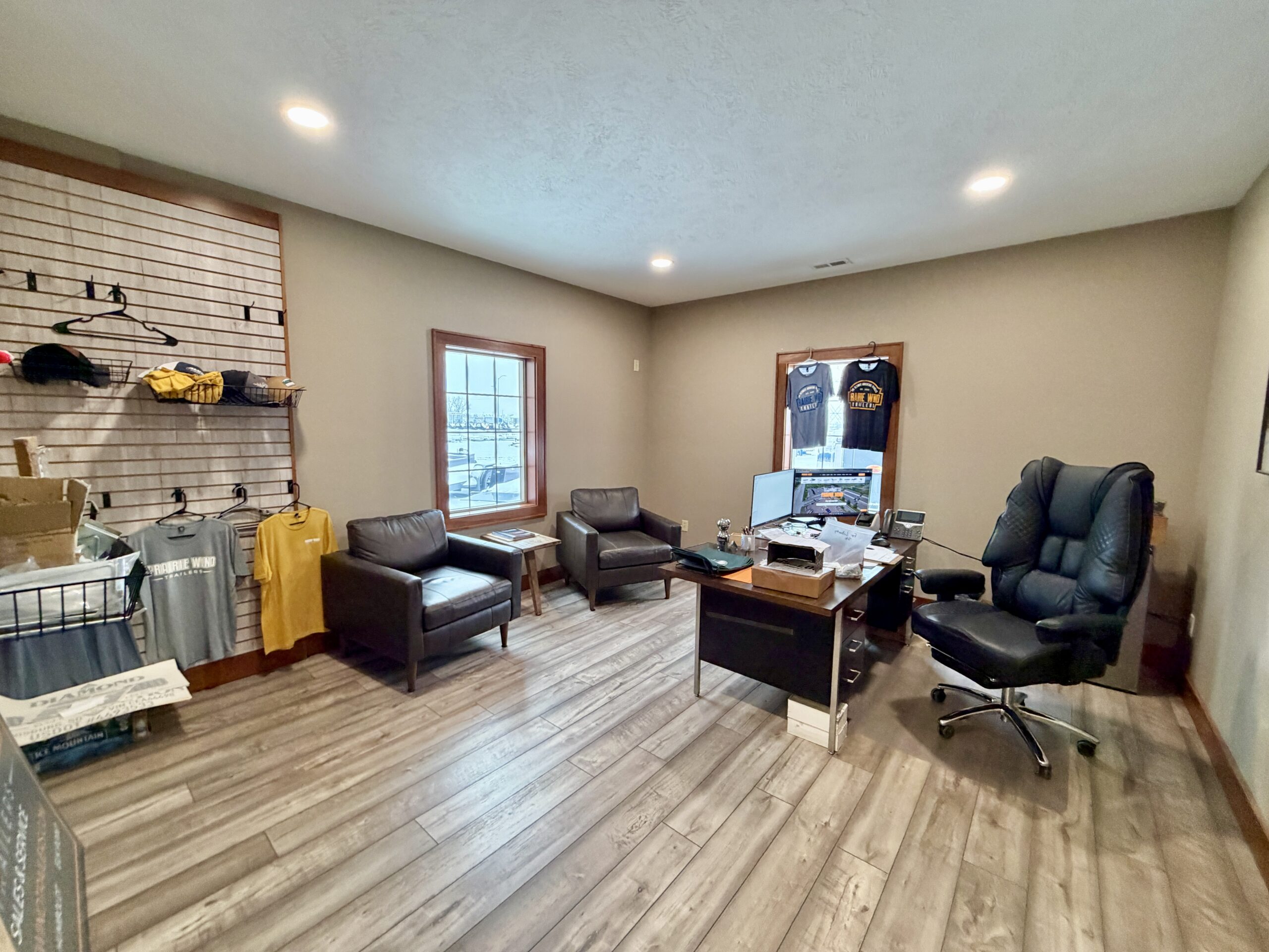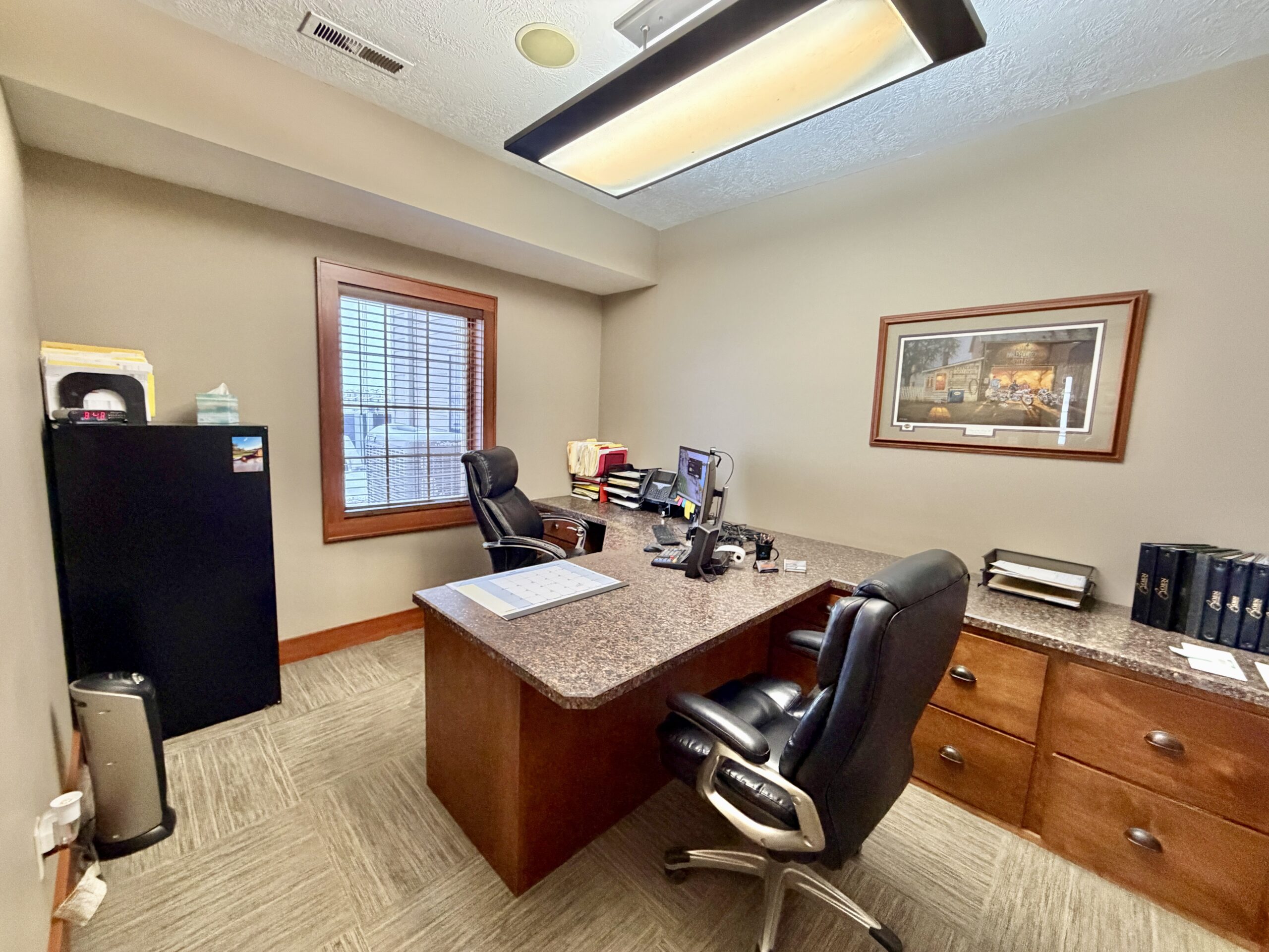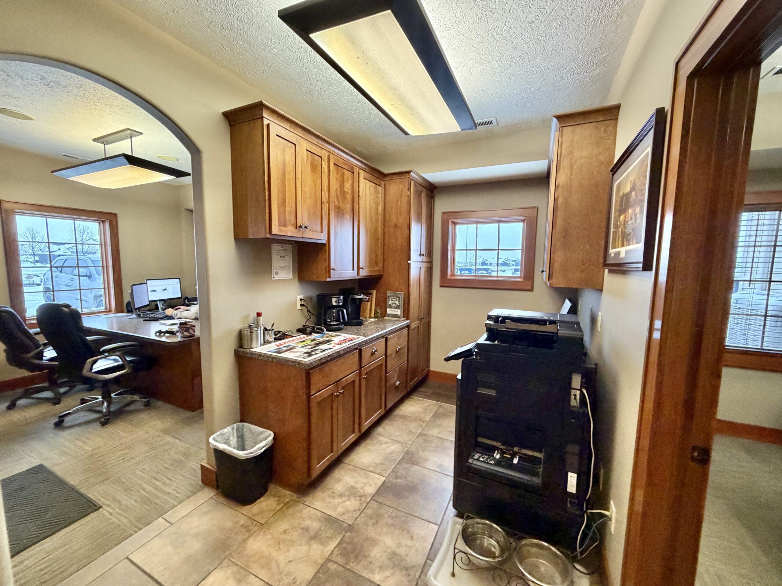 Upper level office with conference room, breakroom with full kitchen and laundry, storage and restroom.
